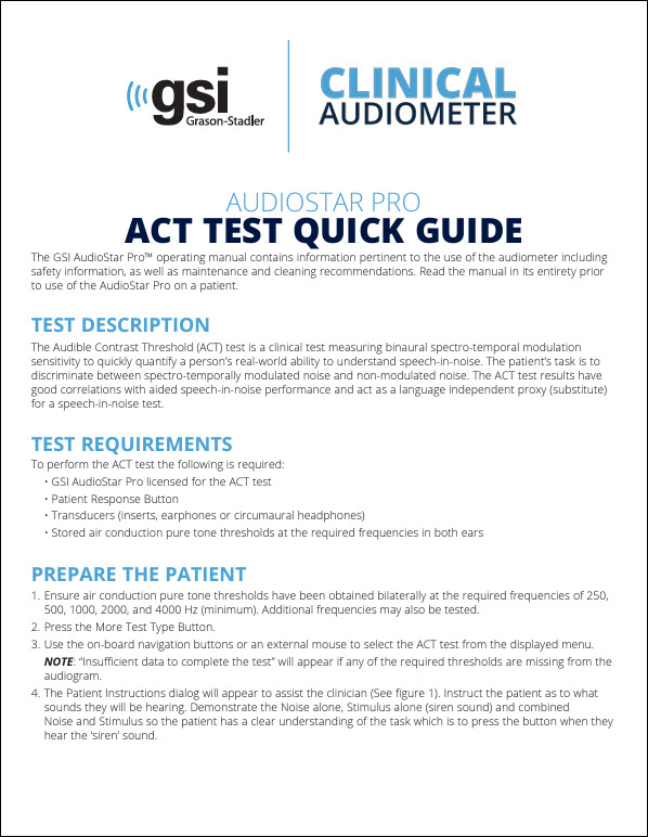 声音对比度阈值测试又称 ACT™,是 GSI AudioStar Pro™ 和 GSI Pello™* 上的一项新测试。ACT 提供 2 分钟的快速测试,可准确评估个人在嘈杂环境中理解言语的能力。不管是何种语言,ACT 结果都与助听器在噪音下的性能具有一致的相关性。这意味着 ACT 测试可以在任何患者身上进行,无论其母语是哪种语言。该测试利用患者的听力测试结果来确保 ACT 刺激是听得见的。